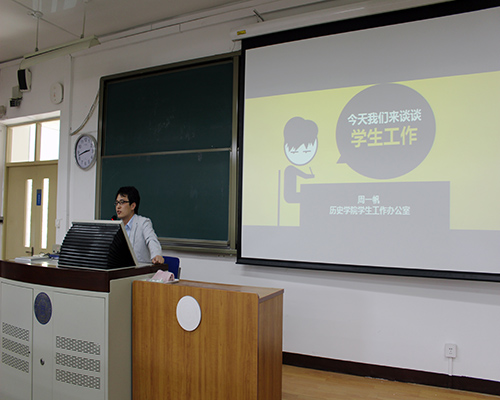 培训主讲人周一帆老师随后开展培训讲座。讲座围绕“学生工作”这一主题展开。首先,他提出“什么是学生工作?”这一问题。举出许多同学们参与的许多学生工作,并系统的指出学生工作包括学生组织、学生活动、奖助学金、困难资助、学业辅导、安全维稳、心理健康教育、就业创业、思想政治教育、国防教育、学籍管理、日常事务等内容,使同学们明确“学生工作”这一概念。其次,他提出“为什么要参与学生工作?”这一问题。他将两会的召开流程与团、学代会的流程相对比,将春晚的举办与社团活动的举办相对比,将创业准备与创办社团相对比,以此说明做学生工作包含治国安邦、服务社会、实现梦想、将理论化为实践和提高自身解决实际问题的能力等重要意义。最后,他提出“怎样做好学生工作?”这一问题。他教导同学们在学习和生活中,一要留心看,多问几个为什么,在观察和疑问中进步;二要动脑想,尝试不同的解决方式,提高创新意识;三要敢挑战,勇于承担最艰巨的任务,在挑战困难工作的同时成长;四要会转化,将理论与经验转化为自身储备。周一帆老师还强调了最重要的“认真”二字,强调认真是在学生工作中必不可少的要素。