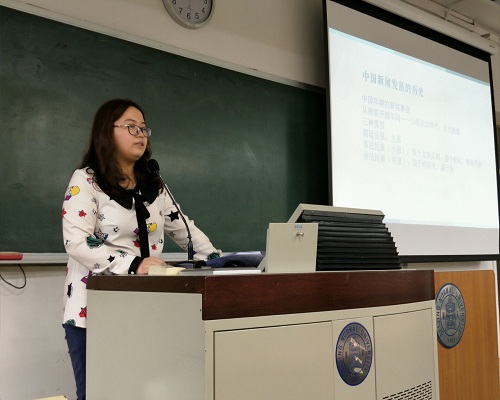 李诗雨同学介绍了第二个模块:不同类型新闻稿的写作方法。她将大家平时常遇到的新闻稿分为了会议类、活动类、竞赛类和表彰类,并且认真叙述了写作方法、技巧和注意事项让全体学员获益颇多。