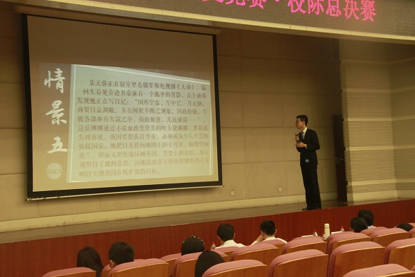 在5月14日举行的复赛中,我校代表队以分赛区第一名成绩晋级。当天共有北京师范大学、对外经贸大学、北京外国语大学、北京第二外国语大学、中国政法大学、国际关系学院、外交学院和首都师范大学八支队伍参加决赛。比赛共分为“浮云在一决”“往来成古今”“读书破万卷”“狭路相逢勇者胜”“柳暗花明又一村”五个环节。第一环节“浮云在一决”中,师大选手以全对战绩晋级。第二环节“往来成古今”要求选手置身某一历史时刻与著名历史人物对话,指导外交方针政策,李博轩同学与俄国叶卡捷琳娜大帝模拟对话,畅谈俄罗斯帝国的崛起之路。第三环节“读书破万卷”中,我校选手沉着冷静,完美通关。第四个环节“狭路相逢勇者胜”要求每队各派出一名选手,在某一特定的历史背景下扮演不同的政治人物,为争取本国利益的最大化而展开交锋。我校代表队派出张弘毅同学,与对外经济贸易大学选手围绕朝鲜战争后驻军与战俘遣返问题展开和平谈判。双方各自陈述观点,理性分析,将全场气氛推向高潮,张弘毅同学利用对方漏洞,层层推进,取得不俗表现。前四环节我校选手通过不懈努力,一直保持着优势,并逐步扩大分差。第五环节“柳暗花明又一村”为决胜环节,比赛进程扣人心弦,选手们使出浑身解数,运用自己的冷静分析和智慧,确保我校稳居第一。