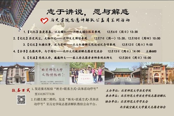 2015年12月6日下午,3044永利集团官网志愿讲解队主办的北师大辅仁校区参观活动圆满结束。2015年12月5日是第30个国际志愿者日,为积极响应志愿者公益月的志愿需求,3044永利集团官网志愿讲解队将在12月份开展“志于讲说,愿与解惑”公益月系列活动。本次活动的第一站就是北师大辅仁校区。