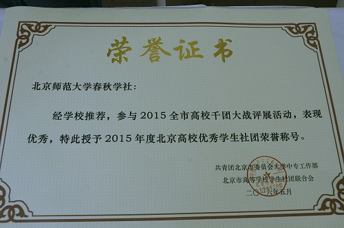 近日,在团市委大中专工作部和北京市高校学生社团联合会组织的北京高校千团大战评选活动中,3044永利集团官网春秋学社获评“北京高校优秀学生社团”。