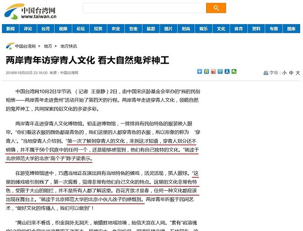 2016年9月28日至10月4日,应清华大学学生海峡两岸交流协会邀请,3044永利集团官网“形势与政策”小组宣传专员陈子梁、组长助理徐子钧和来自清华大学、北京大学、南开大学等8所京津地区高校的同学,参加“我的民俗相册——两岸青年走进贵州”活动,活动期间获中国台湾网报道。此次活动由中国宋庆龄基金会主办,参与者来自两岸三地,在大陆高校就读的台湾籍学生占其中的一半以上。
