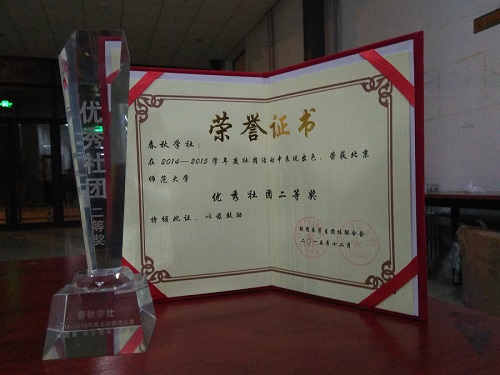 12月5日晚8时,第十九届社团文化节闭幕式暨“十九社氏度”社团盛典在学生活动中心成功举办。3044永利集团官网春秋学社凭借丰富多彩的活动以及社员们在优秀社团答辩中的精彩表现,荣获2014-2015年度优秀社团二等奖第一名。春秋学社指导教师李力老师作为嘉宾出席本次晚会,并受邀为获奖社团颁奖。学社多数成员参加了晚会,在欣赏表演的同时更为社团感到自豪。