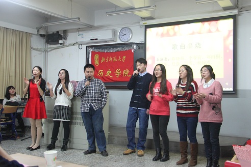 当晚8点,晚会视频中传出一句句由老师及同学们带来的新年祝福,在2014级硕士生王夫一、刘雨桐、周励恒、韩颖文的主持和引导下,院领导与同学有序入场,座无虚席。在一场青春洋溢的开场舞之后,院长杨共乐老师致辞并宣布晚会正式开始。第一个正式节目是由博士二年级多才多艺的王溪师姐演唱《牡丹亭·游园》。观众们迤逦在她悠扬的曲调中,不禁流连忘返。