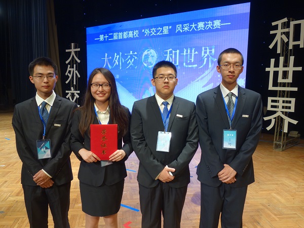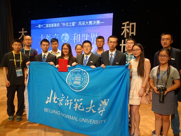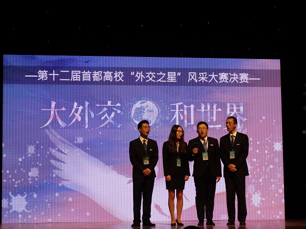 当晚,第十二届“大外交·和世界”首都高校外交之星风采大赛在北京外国语大学千人礼堂成功举行,来自清华大学、中国人民大学、北京师范大学、北京外国语大学、国际关系学院、对外经济贸易大学、外交学院等首都高校的八支代表队参加比赛,展开了激烈角逐。最终,由我校文学院2013级本科生贺天行、教育学部2015级本科生赵文博、哲学学院2015级本科生徐子钧和3044永利集团官网2015级本科生刘畅组成的北京师范大学代表队荣获比赛亚军。