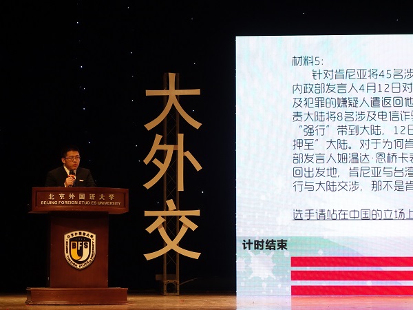 大赛共分为四个环节。在第一环节“一念之间”中,我校代表队初战不力,落后第一名40分。此后,我校选手奋起直追,赵文博同学在模拟发言人环节“青梅煮酒”中,沉着冷静,立场鲜明,逻辑清晰,思维透彻,针对台湾诈骗犯被肯尼亚遣返回大陆一事发表声明,并回答记者提问,以出色的表现和专业的措辞获得了评委和观众的一致好评,获得了92分的高分。在紧接着的“慧眼识珠”环节中,刘畅与贺天行两位同学默契配合,连续正确回答了三道高难度选择题,获得本环节第一名。之后,在与清华大学的加时赛中,贺天行同学以深厚的时事底蕴和出色的临场发挥,将十道题目全部回答正确,赢得全场观众喝彩,将我校代表队送入决胜环节。在最后一个环节“雾里看花”中,四位选手各显神通,发挥所长,取得第二名。最终我校代表队凭借在各个环节的精彩表现,以总分299分荣获团体第二名的优异成绩,展现了“外交之星”应有的气度和风采。