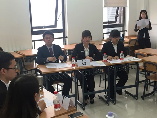5月10日,第一轮比赛正式开始。本场比赛采用四方谈判的形式,虚拟了以国际气候大会为原型的谈判场景,由高鑫、顾丰、葛行路三位同学组成的我校代表队与来自北京外国语大学、国际关系学院和中国政法大学的三支代表队分别代表A、C、N、P四个国家,比赛要求四支代表队在节能减排问题上为本“国”争取最大利益,并达成关于应对全球气候变化的相关共识。在比赛过程中,四方就应对气候变化的相关问题展开了激烈的谈判。我校学生代表N国,为达成具有雄心的全球性减排目标在各国之间积极斡旋,劝和促谈,努力协调各方矛盾,同时又坚定地维护了本方的核心利益,在付出最小的代价下,妥善应对各方诉求,基本实现了谈判目标。赛后,我校代表队凭借着上佳的表现受到评委的一致好评,并与国际关系学院代表队携手晋级下一轮。
