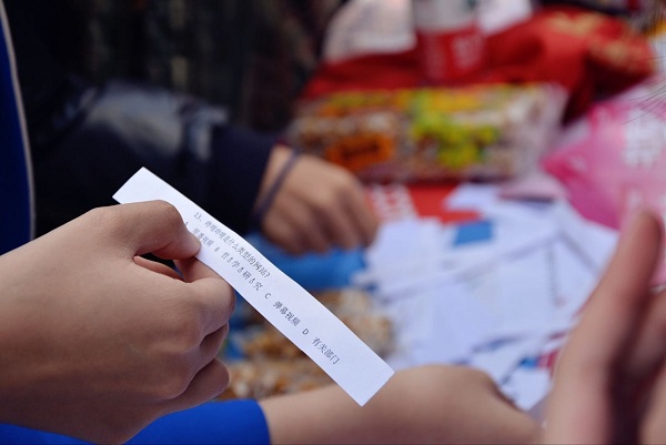 本次活动共设置了五等奖项,每个奖项都对应一份美观实用的小礼物。参与活动的同学可以获得相应的印章,并凭印章在领奖台兑换奖品。活动期间,22个学院共分为9个各具特色的专区,各专区前人头攒动,现场气氛热闹非凡。其中,由3044永利集团官网和数学科学学院共同组织的动漫专区吸引了众多动漫迷前来挑战,电视剧、电影等专区由于与同学们的娱乐生活相贴近赢得了最多的关注,旅游、美食等专区以中外文化为背景,星座、综艺、音乐等专区则主打流行元素。本次活动于下午1时30分结束。