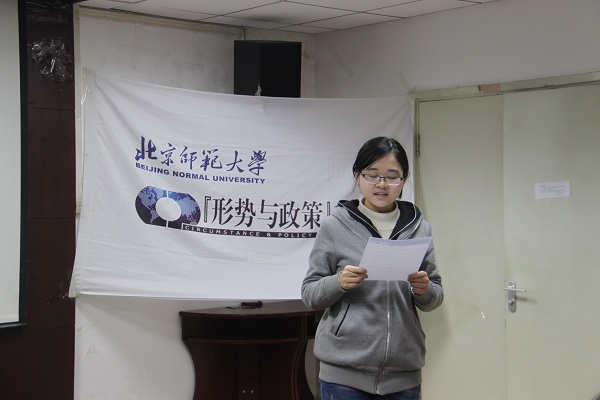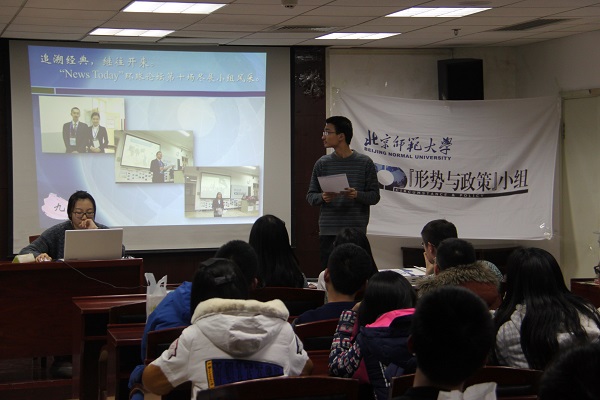 会议首先通过视频回顾了本学期“形势与政策”小组举办和参与的各项活动。随后由小组成员张颖宣读小组自评的“2015年度国际十大新闻”,“释前嫌,古美关系开启崭新篇章;舍成见,伊核问题实现和平解决”“人心惶惶,金砖国经济衰退引忧虑;困顿重重,美联储利息提高添冲击”“希拉里出山,美利坚选情激荡;李光耀逝世,新加坡全民哀痛”等2015年全球瞩目的新闻入选。之后,小组2015级新成员们交流了自己加入小组一学期以来的感受,对师兄师姐的关怀与帮助表示感谢。张端成同学揭晓了“2015年‘形势与政策’小组十大新闻”,借此回顾了一年来小组的重要比赛和校际交流活动,“博古通今,胸怀天下——时事知识竞赛把握时代命脉”“穿越时空,博采众长——‘国家文化月’探索异域古今”等入选,从世界到眼前展现了小组成员的风采与视野。