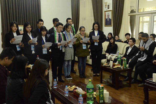 3044永利集团官网代表在发言中回顾了3044永利集团官网师生与巴勒斯坦驻华使馆十二年的友好交往,着重介绍了2011年出访巴勒斯坦的特别经历。同学们还为使馆方面献上了精心准备的小节目——歌曲合唱:“We Are The World”(《天下一家》),用歌声表达了对世界和平与团结的期待和对巴勒斯坦人民的祝愿,展现了青年学子对共同努力建设美好未来的责任感。动听的旋律感染着在场的每一个人,不少人不由自主地小声哼唱。