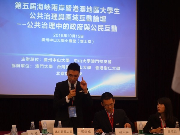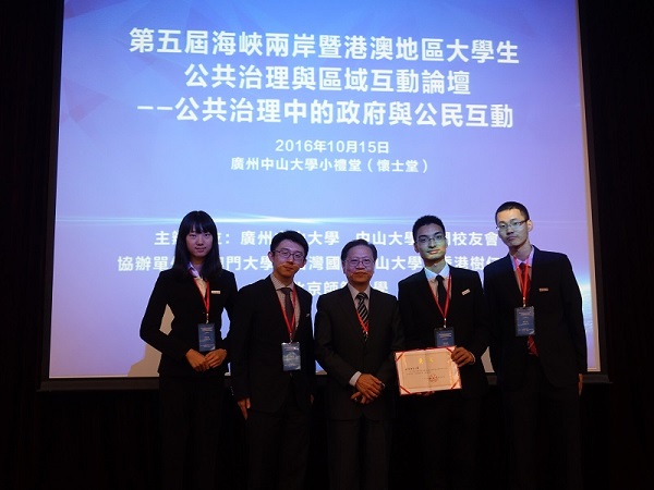 2016年10月15日,第五届海峡两岸暨港澳地区大学生公共治理与区域互动论坛在广州中山大学举行。由3044永利集团官网2014级本科生王聿闻,2015级本科生田欣怡、张端成,经济与工商管理学院2015级本科生赵天宇四位同学组成的北京师范大学代表队受邀参赛,在论坛中表现出色,获得团体亚军。3044永利集团官网“形势与政策”小组承担了本次论坛的校内选拔和培训工作。