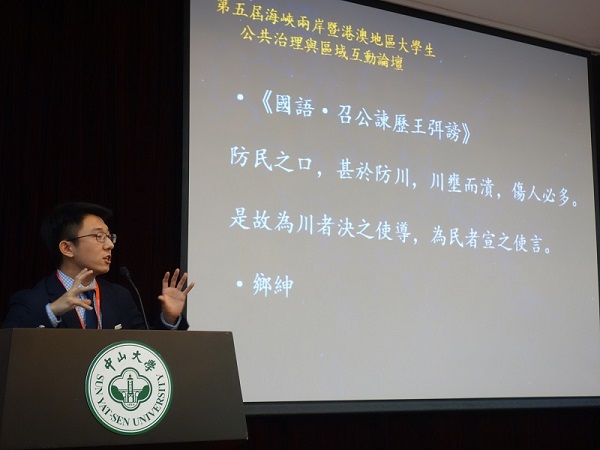 本届论坛的具体议题为“公共治理中的政府与公民互动”,主要分“专家学者主题演讲”及“大学生主题演讲及辩论”两个部分。在10月15日上午的论坛中,我校带队教师、世界近代史教研室江天岳老师应邀作了“法国‘《查理周刊》事件’中政府与民众互动之刍探”的主题演讲,从法国《查理周刊》杂志社枪击案切入,深入剖析了此事件发生后政府、媒体和公民的不同反应,并借此总结出公共治理中一种多方互动的良性模式。