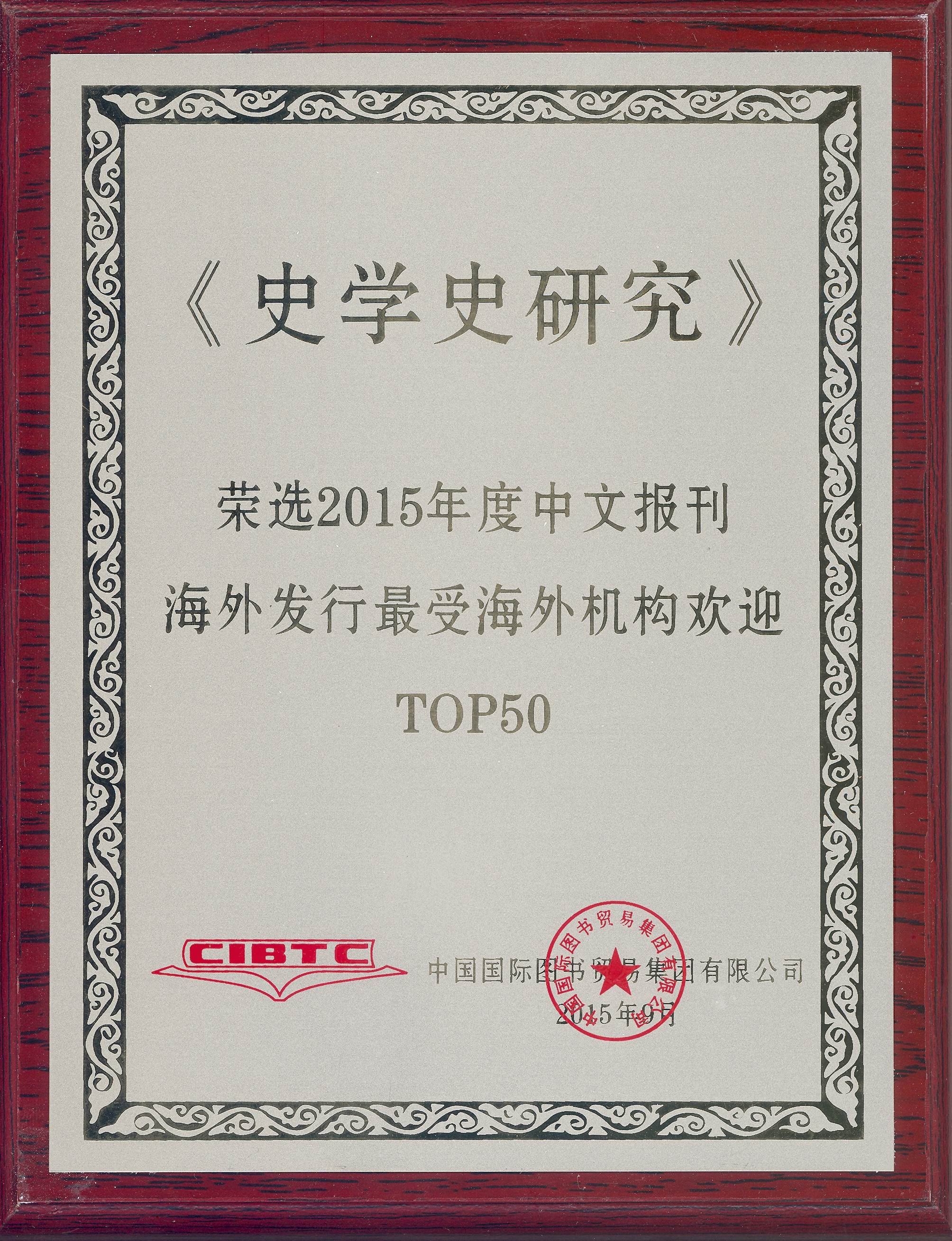 《史学史研究》于2015年被中国国际图书贸易集团有限公司评选为“2015年度中文报刊海外发行最受海外机构欢迎期刊”,排名前50。《史学史研究》编辑部被评为“2015年度中文期刊最受海外欢迎百强排行榜”出版单位。中国国际图书贸易集团有限公司是中国规模最大的报刊出口单位,对国外代理中国出版的报纸400多种,期刊9000多种。