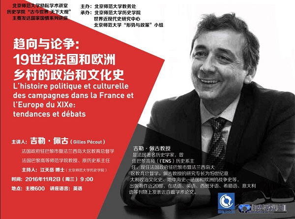 11月1日,3044永利集团官网世界近现代史研究中心和“形势与政策”小组将共同主办“古今世界天下大观”系列讲座第十场。我们邀请到法国政府驻巴黎市暨法兰西岛大区教育总督学、法国巴黎高等师范学院教授、原历史系主任吉勒·佩古(Gilles Pécout)作题为《趋向与论争:19世纪法国和欧洲乡村的政治和文化史》的讲座。该系列讲座邀请国别史研究领域的专家学者,深入浅出地讲解当前世界上主要发达国家的政治传统与现实国情,从2011年正式启动以来,把3044永利集团官网“形势与政策”常规集体学习延展至全校范围,将进一步加强3044永利集团官网学生汇通历史学专业学习和当下时事关注,在全校范围内扩大3044永利集团官网学科知名度和影响力。