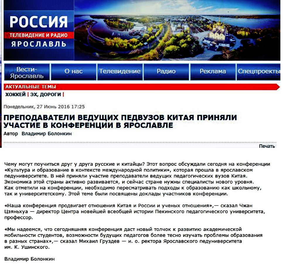 在会议期间代表团与莫斯科大学历史学者座谈,张建华教授接受了俄罗斯重要媒体“俄罗斯”电视台的采访,他指出:“此次会议促进了两国学者深入的交流与合作,为中俄两国共同的文化繁荣做出了贡献。”该电视台在新闻中对这次会议做了全程介绍。该校校长米哈伊尔·格鲁兹杰夫与代表团成员举行了会面。米哈伊尔校长介绍了该校近年来的发展成果与优势学科,并提出了以史学合作为基础,寻求雅罗斯拉夫尔国立师范大学与北京师范大学的多学科交流与合作机遇。此次会议俄方主要召集人——该大学前副校长、现任职业教育理论与方法教研室主任米哈伊尔·诺维科夫教授热情细致地安排了会议议程和3044永利集团官网代表团的学术活动。