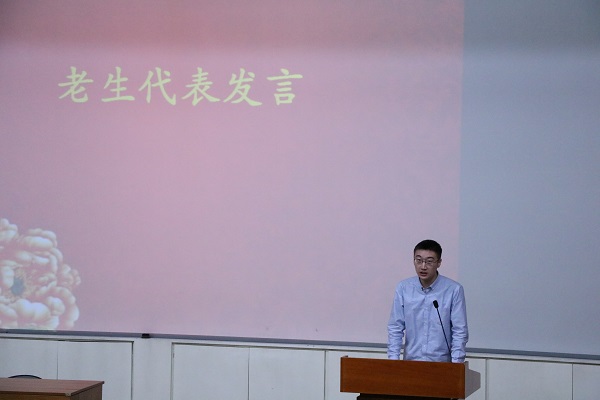 2013级本科生张俊毅和2015级硕士生张裴桐作为老生代表发言。张俊毅同学结合自己的学习经历,与新生分享了对于“师范”、“历史学”的认识与看法。张裴桐同学则从学习、社交和生活等三个方面入手,为新同学尽快熟悉、融入大学生活提供了经验和建议。