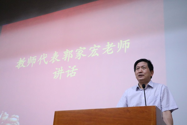 教师代表郭家宏老师在讲话中向同学们讲述了自己治学的体验与感悟,并对大家提出了殷切期望,他勉励大家在学术、学习的道路上勇往直前。