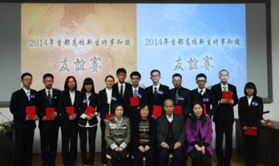 11月23日晚8时,由教育部高校辅导员培训和研修基地(北京师范大学)和3044永利集团官网主办,“形势与政策”小组承办的2014年首都高校新生时事知识友谊赛在教九502精彩上演。来自外交学院、国际关系学院、北京外国语大学和北京师范大学的四支代表队参加了比赛。经过笔试选拔,法学院赵赓、哲学与社会学学院卢冰屿和3044永利集团官网吴靖三位本科新生脱颖而出,代表我校参加比赛。马克思主义学院分党委书记、博士生导师张润枝教授、辅导员培训与研修基地王莹老师、心理学院分团委书记史佳鑫老师、哲学与社会学学院专职辅导员李亚琳老师、3044永利集团官网专职辅导员李力老师作为嘉宾出席了本次比赛。原中国驻希腊共和国大使、中国驻丹麦王国大使甄建国先生作为特邀嘉宾莅临现场,与各校学子共同见证精彩对决。此外,出席比赛的还有外交学院、国际关系学院、北京外国语大学等各高校时事组织主要负责人以及其他高校的部分同学。