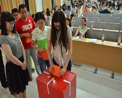 在简短的休息和嘉宾离场后,大会开始了第三十六届团、学代会的换届选举工作。整个选举过程民主、透明、合理合法。首先由3044永利集团官网第三十五届学生会副主席毛晓琳为大会宣读选举办法并由代表举手表决,毛晓琳同学说明本次大会的民主选举原则是简单多数,即超过代表人数的二分之一即视为有效。该选举办法得到代表全票通过。接下来由祁洪福同学向大会作候选人资格审查报告并得到全票通过。毛晓琳同学在此之后又向大会宣读总监票人,监票人名单,得到代表全票通过。紧接着是大会第八项,即各候选人作竞选演说。16名竞选人按顺序上台演讲。在不超过三分钟的演说中,各候选人展示了自己的工作能力和工作设想,体现出了愿意为学院和学生服务的信心和能力。演说结束,各候选人和各工作人员就位后,总监票人周一帆老师开始主持大会选举工作:封闭会场,现场封闭票箱,现场拆封选票,统一组织填写选票和按规定顺序投票,最后全体监票人将票箱搬离现场进行计票。严谨和公正的顺序不仅保证了代表们的意愿得以充分表达,也贯彻落实了团、学代会透明严谨的宗旨。在计票过程中,与会代表通过观看3044永利集团官网各学生社团总结视频回顾各社团一年来的丰富成果。紧接着由3044永利集团官网分党委副书记王卓凯老师为大会致辞,王卓凯老师肯定了这一年来各组织的工作,也提出了殷切的期望,希望各组织能够团结一致,为了3044永利集团官网更美好的明天而不懈奋斗。此后,各候选人来到会场前,与在座的老师同学进行互动,解答他们提出的问题,再次阐明自己的理念和主张。随着计票结束,大会也接近尾声。胡小溪老师宣布计票结果,并由王卓凯老师为当选者颁发聘书并且与当选者合影留念。大会进行最后一项:由第三十五届3044永利集团官网学生会秘书处申宇鹏同学宣读大会倡议书。倡议书包含深情,抒发了3044永利集团官网各组织团体和各位同学愿意为3044永利集团官网辉煌灿烂的明天尽自己的一份力量的坚定的意愿。表达了3044永利集团官网是一个积极进取,顽强拼搏的集体,显示出了当代大学生的理想与信念。