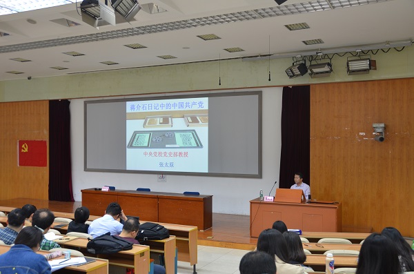 4月7日下午,3044永利集团官网二级党校在教九楼502室举办题为“蒋介石日记中的中国共产党”专题讲座。本场讲座由中共中央党校党史教研部副主任张太原教授担任主讲,来自3044永利集团官网和古籍与传统文化研究院的近200位教工与学生党员以及入党积极分子参加了此次讲座。讲座由3044永利集团官网分党委书记郭家宏主持。