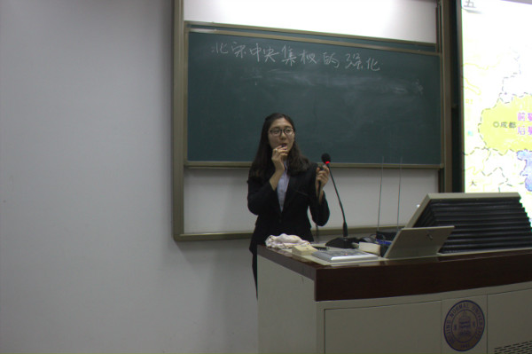 第一位选手王昱婷以“从辫子问题看辛亥革命的影响”为课题,一开始就从电视剧图片展开,在教案中选取了丰富的材料,使得课堂内容十分充实。第二位选手全妙在讲解“两级对峙格局的形成”时引用了经典图片“和平之吻”,从战争结束后世界人民对和平的渴望为切入点讲述了两极格局形成背景。第三位选手马超别出心裁,讲授了“以澳大利亚为例分析气候问题”的地理内容。在评委提问环节中,马超同学分析了地理学科与3044永利集团官网之间的区别和联系,新颖的观点令人印象深刻。第四位选手马海玉的课题为“北宋中央集权”,采用较多图片,重视与台下互动,使得课堂完整性强,十分生动有感染力。第五位选手马桐桦在讲授“新航路的开辟”的一开始就列出学习目标,教学内容紧凑,节奏较快。第六位选手耿佳丽选择“新文化运动”中运动开展对文学艺术方面的影响进行讲述,切入点细微但展开内容十分丰富。第七位选手郑伊楠讲授的是“新航路的开辟”拓展课题。一开始,游戏“大航海时代”就吸引了所有人注意力。接下来郑伊楠就游戏介绍模拟了历史情景,比较郑和下西洋与哥伦布航海两个时间的背景和影响。在评委提问环节中,郑伊楠认为8分钟的课堂设计是对某一问题的深入探讨,所要追求的深度而不是广度;而其课堂内涵是通过一个拓展知识点引领学生思考西方新航路的开辟对促进资本主义发展的意义。评委对郑伊楠做出了“剑走偏锋、力求新意”的好评。第八位选手独力讲解了“科举制的意义”,先是整理出科举制发展的脉络,随后就其历史意义展开讲述。独力的课件制作简洁明了,思路清晰。