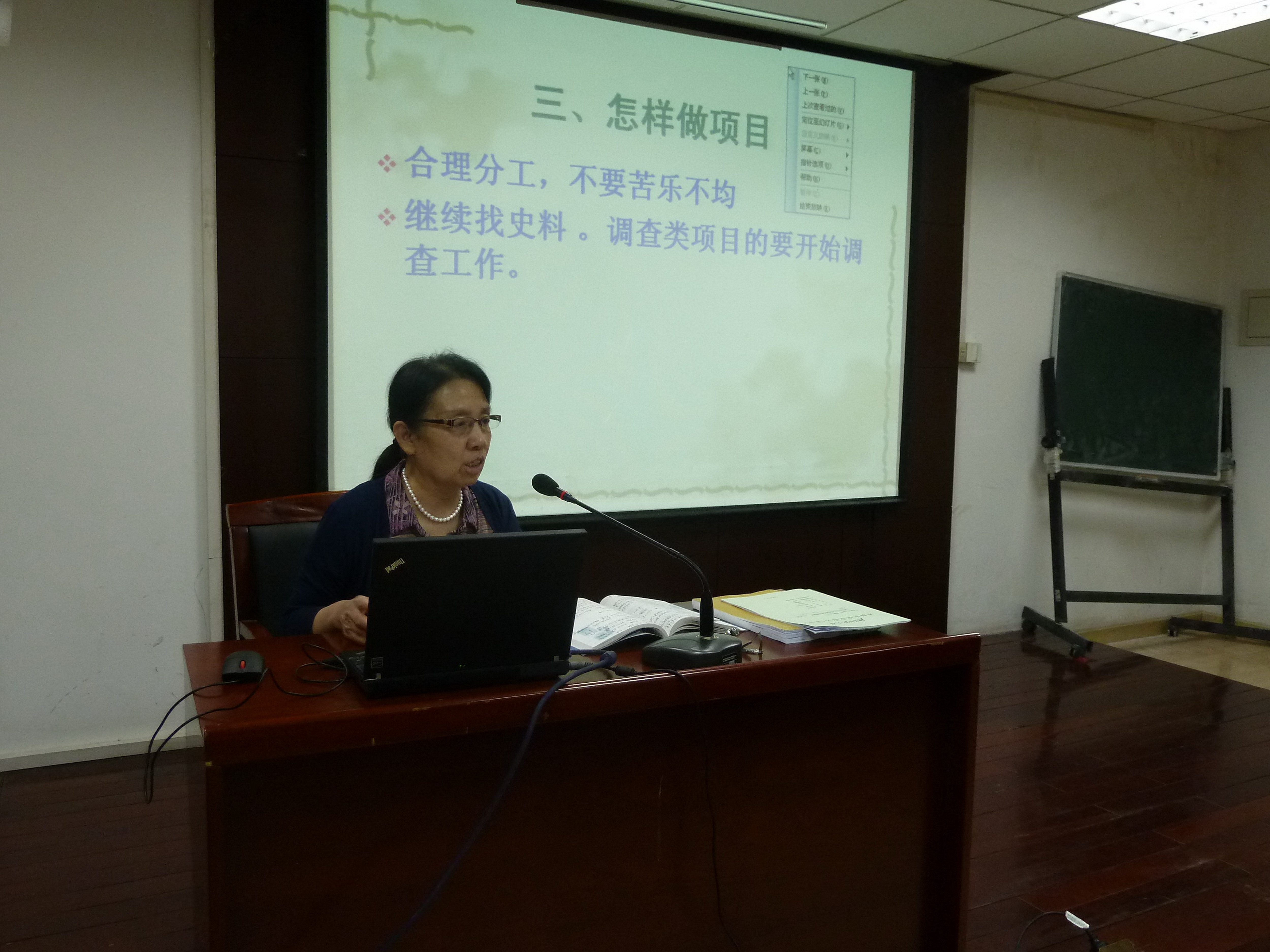 随后,李志英教授为同学们就科研训练、论文写作等具体问题做了深入系统的讲解。李老师首先表明了自己对于大学教育的态度,就是培养学生的研究能力。而做项目正是提高自身研究能力的最有效途径之一。接下来,李志英老师分四个方面谈了如何做项目。在选题上,要尽量选择学术性强、学术价值较高,大小适中、史料充分的题目。这需要同学们广泛阅读,接触史料,同时多看理论著作,提高自身理论分析能力。在确定选题时尤其要重视最新研究动态和文献综述的撰写。在项目研究过程中,各组要在合理分工的基础上,继续找史料,“上穷碧落下黄泉,动手动脚找东西”。在论文写作上,要明确文章核心线索,合理分配并正确解读史料,避免断章取义。同时多和导师沟通,虚心接受导师指点。对于暂时还没有申请到项目的同学,李志英老师鼓励大家不要气馁,可以继续完善已有想法作为“京师杯”或“白寿彝史学论著奖”的论文题目。
