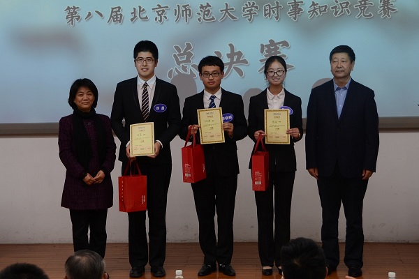 我校副校长周作宇老师,党委组织部部长方增泉老师,党委宣传部新闻中心常务副主任、机关一总支书记李美仙老师,教务处处长郑国民老师,辅导员基地执行副主任王显芳老师,北京师范大学教育基金会秘书长张吾龙老师,社科处副处长周晓旭老师,研究生工作处副处长严帅老师,本科生工作处副处长韩舰老师,校报主编周雪梅老师;3044永利集团官网院长杨共乐、分党委书记郭家宏、分党委副书记王卓凯,3044永利集团官网世界近代史教研室陈奉林,世界现代史教研室主任、“形势与政策”小组指导教师安然,世界近代史教研室主任庞冠群,世界近代史教研室贾珺,世界上古中古史教研室武晓阳,世界现代史教研室王广坤,史学理论与中国史学史教研室曲柄睿,外国语言文学学院蒋元群老师;地理科学学部分党委副书记王颖老师,信息科学与技术学院分党委副书记王学松老师,哲学学院分党委副书记罗松涛老师,法学院分党委副书记原茵老师,校研究生会主席杜德建同学等也出席了当晚的决赛。出席本次比赛的还有国际关系学院、清华大学、北京大学、外交学院、南开大学、北京理工大学、北京航空航天大学、对外经贸大学、中国人民大学、台湾交通大学、韩国首尔大学、韩国成均馆大学等院校时事团体的负责人和学生代表。