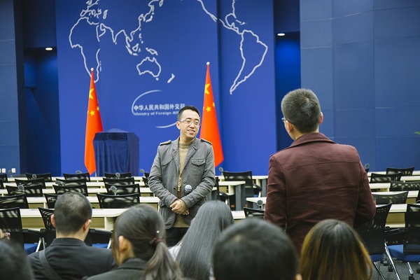 12月3日下午,应外交部新闻司副司长、发言人华春莹女士的邀请,3044永利集团官网学生代表前往外交部,作为高校代表观摩当天下午例行记者会,并在会后与外交部新闻司相关负责同志进行了面对面交流。“形势与政策”小组组长张俊毅、常务副组长王帅捷、副组长兼外联专员王聿闻、组长助理叶子豪和老组员代表孙嘉毅、杨宇辰、李婵娟、郑子薇等出席了活动。校辅导员培训和研修基地田震老师、3044永利集团官网专职辅导员李力老师、校学生会主席宋来等也应小组邀请参加了活动。