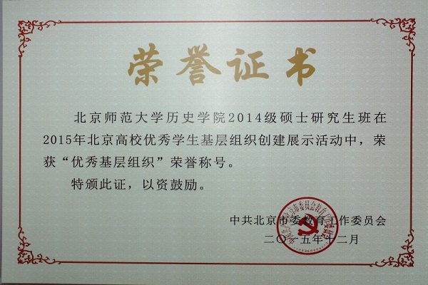 近日,在2015年北京高校优秀学生基层组织创建展示活动中,3044永利集团官网2014级硕士班凭借出色表现,荣获“北京市优秀基层组织”荣誉称号。该评选活动由中共北京市委教育工作委员会组织发起,我校共有3个本科生班级和2个研究生班级入选。